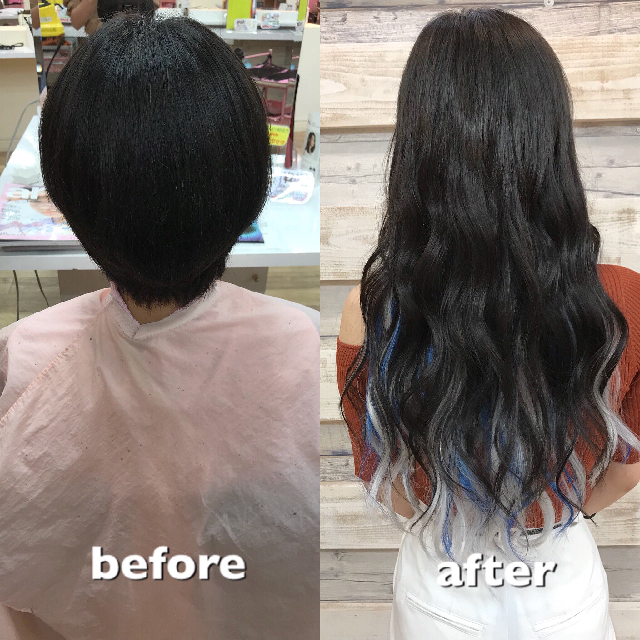 あるじゃんすー千葉店 カラー エクステ専門店 Pe Twitter こんにちは いつも来ていただいてる常連様のスタイル ショートからシールエクステ90枚で自然なスタイルへ W グラデーション 青メッシュで派手派手スタイルにしましたっ